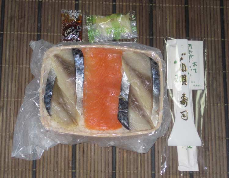 その名前は私でも知っていて、 前から食べてみたいと思っていた駅弁でした。(^-^) そして前回新青森駅にいって見つけたときは売り切れだったので、 今回は直ぐに買ってしまって駅の中をずっと持ち歩いていました。(^-^;) 寿司と言ってもご覧のパッケージはしっかりしていたし、 押し寿司と言う事は分かっていたので型崩れは心配していませんでしたが、 いくら酢で〆た鯖と鮭とは言え生ものなので悪くなるまでは行かなくても、 臭いなどがするようにはならないか、だけが気になりました。(^-^;) さて7時間後に家であけてみたら確かに梱包はしっかりしていて、 中身もびっしりと入っていて型崩れは一切無しです。(^-^)/ そして匂いの方は少し鯖っぽい香りがするだけです。(^0^)/ いわゆる「臭い」ではなくて「香り」です。\(^o^)/ そしてサバの切り身は大きくてもしかして「八戸前沖サバ」かな? なんて思ったりもします。(^-^) そして真ん中のシャケ身が赤くて明らかに紅ザケで、 見るからに美味しそうに見えます。(^0^)/ 早速一緒に付いてきた三味線のバチみたいなもので、 切って食べようとしたのですが、 鯖の切り身は切れるものではなくて、 形が崩れてしまうので、 ナイフで切って食べました。(^-^) その味は確かに美味い。 〆サバの味が酢の入り方が程よくサバの旨味が凄くあって、 噛むほどに美味しいと感じるほどです。(^o^)/~ さすがに大きいサバは美味しくなると言う見本みたいなものです。(^-^)/ 真ん中のシャケはあまり魚の味がしないほど旨味は感じなかったのですが、 その後に食べたサバがまたまた美味しいのです。\(^o^)/ 結局、少しも残さず一気に食べ切ってしまいました。(^o^)/ とにかく美味しかったです。(^-^) 食べ終わって少ししたら、 少し気になることがありました。(^-^;) 確かに美味しいので又買って食べたいとは思いますが、 お土産や自宅で食べるのは良いのですが、 弁当としてはどうかな?と思います。(*_*;) 駅弁なんてものは色々な味が楽しめる、 と言うことが一つの喜びかな?と思うからです。(^-^) 幕の内弁当などはその典型的なもので、 色々な素材や様々な味が楽しめるのが良いところだと思うからです。(^o^)/ その点、「八戸小唄寿司」の味は2つの味とガリの箸休めだけです。(^-^;) ちょっともう少し他の味のものも一緒に食べたいな、 と言うのは私のわがままでしょうね。\(^o^)/ |