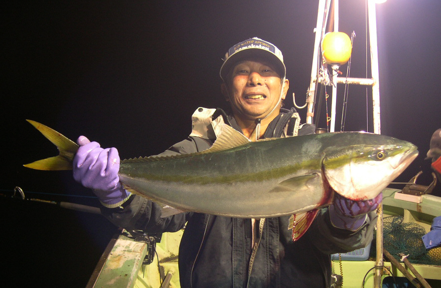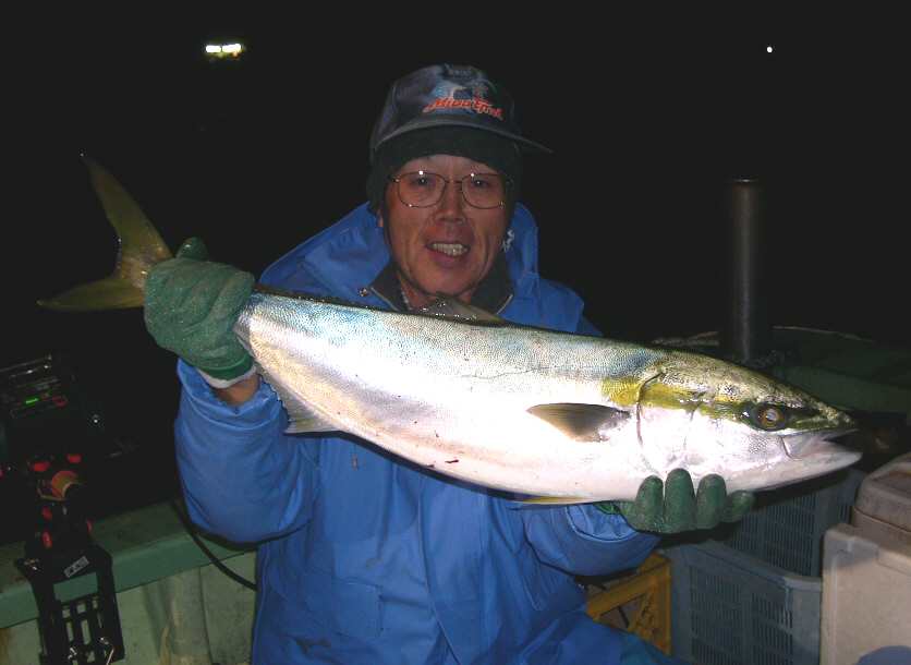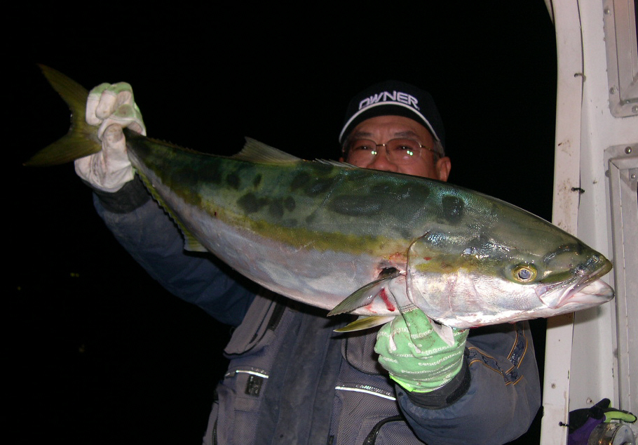18日の土曜日の5時に今別漁港を出港。 海は凪ている。(^-^)/ 宇鉄の少し手前の沖54mラインでアンカーを打って船を泊める。 えさの秋刀魚と冷凍のイカを付けて胴付き3本バリ仕掛けを下ろす。 暫くして、私の竿にガクガクガクッ!と当たりが出る。 大きく竿をあおって合わせいれて巻き始める。 それと同時に船の皆にも当たりが。 文字通り戦場となる。 私の最初の1匹は途中でバレてしまったが、 すかさず入れなおして底についたと思った瞬間また当たりが! 今度はリールが巻けない。 どうやらダブルで掛かったらしい。 ラインを手で引っ張りながらやっと水面へ。 28号のハリスをつかんでゴボウ抜き。 もう1本は? 大型のマツバサルカンが飛んでいた。(*_*;) そして再度仕掛けを投入するも当たりは去ってしまった。 後ろを見ると、今回竜飛のブリ釣りは初めてと言う釣り爺ィさんのところにもブリが転がっていた。 小鹿船長にも手伝ってもらったそうだが、 3本はお見事でした。(^-^)/ 他を見ると、同様に皆ゲットできていた。\(^o^)/ 皆が顔を見られただけでもまずは安心だ。 そして、そのあとは見事にあたりがなくなって、 やがて潮変わりまでは何事も無く過ぎてしまった。 その時は、ヨッチャンに7キロくらいのブリが食いついて、 良し!待ってました!と身構えたのだがそれで終わってしまった。 結局、皆で4~7キロの14本のブリとワラサが釣れて終了だった。 豪快なえさぶり釣りを堪能したとは言えないが、同船の皆が釣れたし、脂が乗って美味しい今時のブリが食べられるのもたまらなく嬉しいものだ。\(^o^)/ PR |