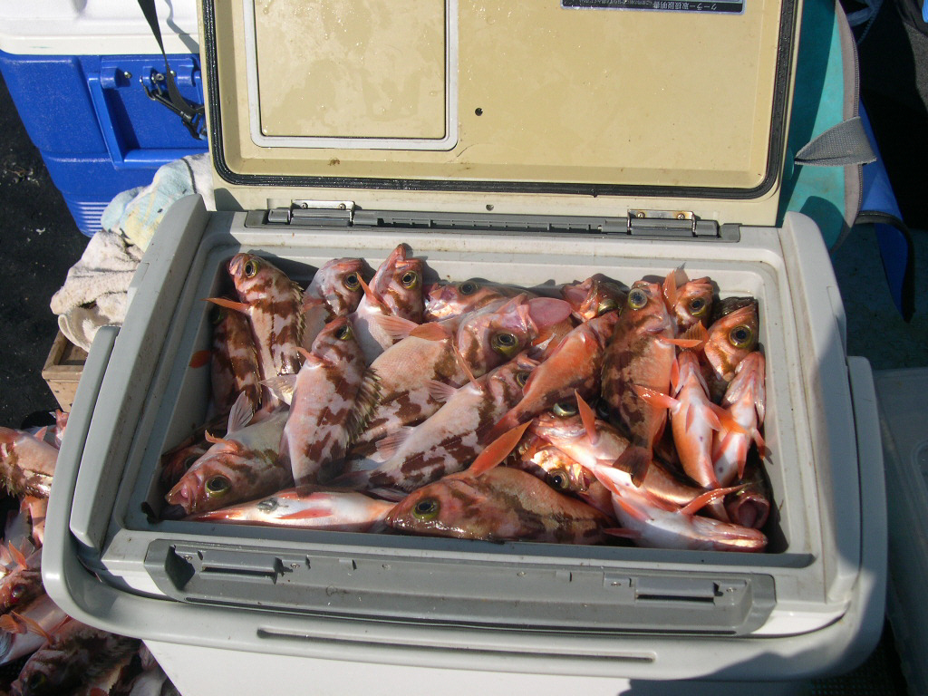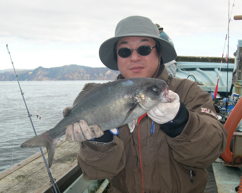 朝6時半に平舘漁港を出港。 最初は、魚の反応を探して前沖へ・・・。 魚探の反応を合図にサワラを狙ってジグを投入。 誰にもカスリもしない。 次の反応では、ベイトを確認すべくサビキをつけてみる。 すぐに魚が食いついてアジが上がる。 しかもサビキ4本に4匹掛かってきた。 これをエサにヒラメでも狙おう!と言うことに。 皆サビキを付けるが、 大きなサビキを付けている人にはアジは掛からない。 その代わり、黒メバルやオキメバル(テンカラ)が掛かったりしている。 小さいサビキでえさを釣ってる人にはアジしか掛からない。 ??? もしかして、わざとえさを釣らないでいい魚を狙っている??? ずる~い!\(><)/ その内千代ちゃんが慎重に巻いている。 竿は大きく曲がっている。 タモに入ったのは、なんと60cmオーバーの大きなヒラメ! 千代ちゃんいわく、「アジが掛かったのでわざと底に下ろしたのさ」 千代ちゃん、ご立派!\(^o^)/ そのヒラメ仕掛けで狙ってもヒラメは来ないし、テンカラも型が小さい。 そこでもっと大きなテンカラを釣ろう!と言うことに・・・。 釣れる!釣れる! 8本のサビキに次々と食いついて殆どがハリ数パーフェクトの満貫! ここで新しい発見が! 本来の対象魚が、アジ、サバ、ハマチのサビキにテンカラに大当たり! しかも大きいのがよく掛かる! これは、メッケモノ~!V(^0^)V SHOPで仕入れなくちゃ! そのうちに、白戸さんにタモが入った。 なんと私が始めて目にする メダイ 凄く美味しい魚だそうだが羨ましい~!\(^o^)/ テンカラは釣れに釣れて私が120数匹でクーラー満タン。、 船長の15本バリ仕掛けで船長と二人で釣った爺ィさんは100数十匹。 皆大漁に大満足でした。 後半戦に続く。 後半戦はいかに? 平館の同船の仲間3人は他の仲間に別れを告げた。 そして、夜のブリ釣りをするために平舘から今別漁港に向かった。 その結果は、4時出港の11時帰港するまで魚の顔を見たのは えさのサンマとサバ、アジ、そして唯一の獲物のフグ1匹だけだった。 本命は結局1匹も釣れなかった。\(><)/ ここで久し振りの言葉を思い出してしまった。 フグを釣ったヨッチャンを除いた皆に当てはまる言葉。 そう! PB! (パーフェクトボーズ) おわり PR |