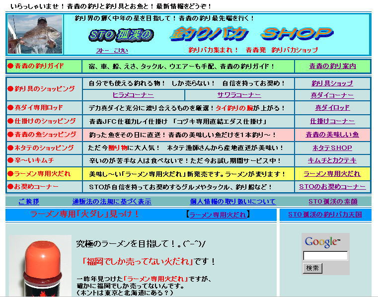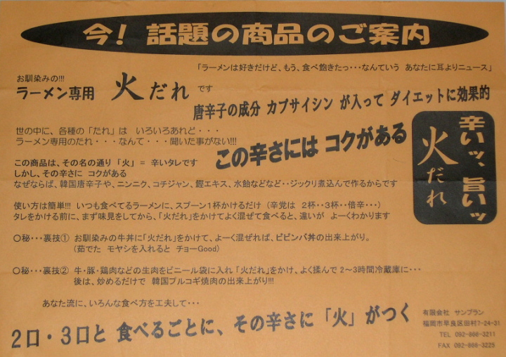 お待たせしまた!(^o^)/~ 満を持して新発売です。 ラーメンに初めて入れて食べてから4年になります。 1本目は試しに購入。 入れた瞬間にラーメンの味が変わった。\(><)/ そして美味しい、美味しいと使い、あっという間になくなった。(*_*;) 送ってもらうように頼もうと思っていたら、 空のボトルは捨てられてしまっていた。(ToT;) その後去年の春になって福岡に行く事になった。 売ってるのが解るのは福岡空港しかないので、 時間のあるうちに15本買いだめ。(^-^)/ 福岡にいる間その重さに、後で勝ったほうが良かったかなあ・・、と。 でも帰りには、殆ど時間がなかったため、 その重さに耐えたことが報われた。(^o^)/~ 青森に帰ってきてから、友達にお土産で1数本上げる。 残った数本を1年弱で使い果たした。(^o^)/~ 無くなってからは、ラーメンがつまらなくなってしまったほど。(*_*;) でも今度は間違いなくボトルを捨てられる前に電話をする。 そして届いた「火だれ」。 同時に火だれ屋さんとネット販売について交渉成立。\(^o^)/ そしてここに新発売~!V(^0^)V 釣りバカSHOP「美味し~い!火だれ」 福岡からの送料は少し高い。(*_*;) 私には美味しいのが解っているから高いとは思わないが、 安いに越したことは無い。(^-^)/ その送料を安記する良い方法があった。V(^0^)V 送料は、一本に付きたったの¥35円!\(^o^)/ ご納得できたら今すぐご連絡を!\(^o^)/ 「美味し~い!ラーメン専用火だれ」ご注文 どうぞ、お試し下さ~い!m(-_-)m |